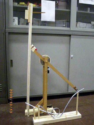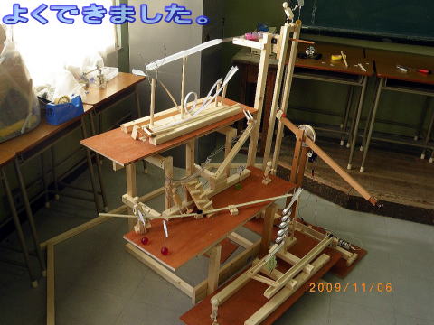 | 重力との戦いです。コースの接続部分や高低差が 2mmずれると・・・・・・・もうダメです。これは絶妙の バランスで、成り立っているのです。 10回のうち8回は失敗します。 観客が多いと失敗します。(おそらく、人が多いと 人が発する熱や移動にともなう気流の乱れ、二酸 化炭素の影響などの相乗効果でバランスが崩れる のでしょう)・・・・・・・・・・・・・・・・ ・・・・・・・・・・・すいません・・・言い訳です。 とにかく、人が見てると成功しないのです !!! (さすがは、選択物理チーム。観測が状態を変化させ るという量子力学の1つの解釈をみごとに検証しまし たね。) |