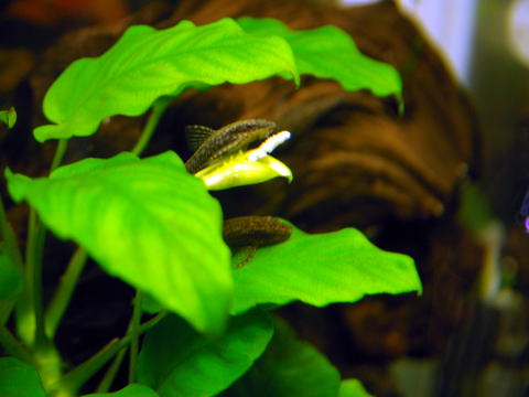 水草アヌビアス・ナナに花が咲きました。 なかなかめずらしいことだそうです。 仏炎苞(ぶつえんほう)に包まれた花です。 同じサトイモ科のミズバショウやカラーに似ています。 オトシン・ネグロが休憩中ですね。 仏炎苞・・・サトイモ科に特徴的な花で、棒状の花を包み 込む苞が、仏像の背景にある炎を型どる飾りに似ている ことから、この名前がつきました。 |