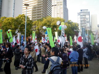 平成22年11月20日 「頑張れ日本!全国行動委員会」in 大阪の デモに参加しました。 写真は出発地点の公園です。 あるじも高さ3mの日章旗を掲げて参加です。 |