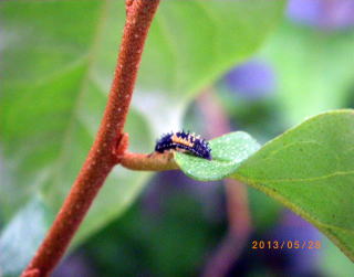 ジベレリン処理(4月中旬)の後、アブラムシが大発生(+_+) 農薬をかけようかと思い近づいて見ると、アブラムシの捕食者であるナミテントウを数匹発見。 (写真はナミテントウの幼虫) 自然は上手いこと出来ています・・・(・o・) これで農薬を使わずにすみました。 テントウムシのおかげで、現在、アブラムシはほとんどいなくなりました(^_^) |