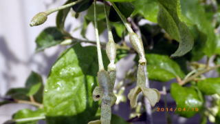 自家不結実性(自分の花粉では実がならないので、受粉木が必要)なので、1本の木で育てるときはジベレリン処理をして実をならせます。