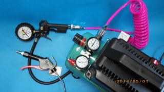 付属品は無かったので、エアーホース(ピンク)、エアチャックガン(タイヤに空気を入れるヤツ) 、エアーダスター(埃をエアでシューと吹き飛ばすヤツ)も同時に購入しました。