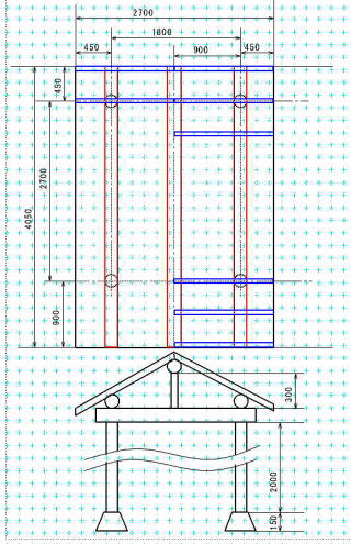平面図です。 作業手順として、 ・伐木 5本。皮むき・乾燥(伐木した桧を柱や梁に使います) ・整地 ・水盛り遣り方工事(柱の位置や水平を出します) ・墨付け、刻み(丸太を加工します) ・建て方(組み立て作業のことです) ・屋根仕舞い(屋根工事) ・風呂工事 ・・・ などです。 以後、進捗状況を不定期にUPしていきます(^o^) 2014.8.8記す |