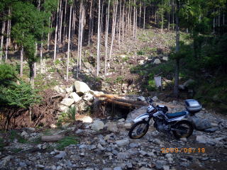 2009 夏 セローでガレ場アタック。 8月10日の豪雨による山崩れや道の 崩落あり。ここでUターン。 |