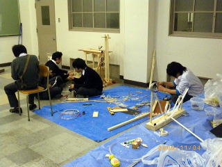 | 重力との戦いです。コースの接続部分や高低差が 2mmずれると・・・・・・・もうダメです。これは絶妙の バランスで、成り立っているのです。 10回のうち8回は失敗します。 観客が多いと失敗します。(おそらく、人が多いと 人が発する熱や移動にともなう気流の乱れ、二酸 化炭素の影響などの相乗効果でバランスが崩れる のでしょう)・・・・・・・・・・・・・・・・ ・・・・・・・・・・・すいません・・・言い訳です。 とにかく、人が見てると成功しないのです !!! (さすがは、選択物理チーム。観測が状態を変化させ るという量子力学の1つの解釈をみごとに検証しまし たね。) |