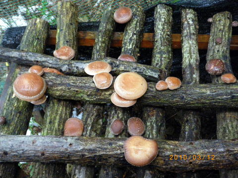 椎茸のホダ木には直射日光を避けるため寒冷紗 がかけられています。その上に5cmほど雪が積もっ ていました。 寒冷紗をめくると・・・ 椎茸がボコボコでています。 さっそく、1つ焼いて食べましたが、つるつるっとして コシがあって、アワビのような食感です。 とにかく、ウマイとしか言いようがないうまさです。 背中は痛いですが幸せを感じた一時でした。 |