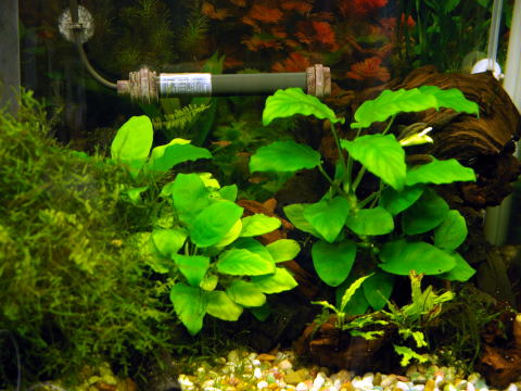 水草アヌビアス・ナナに花が咲きました。 なかなかめずらしいことだそうです。 仏炎苞(ぶつえんほう)に包まれた花です。 同じサトイモ科のミズバショウやカラーに似ています。 オトシン・ネグロが休憩中ですね。 仏炎苞・・・サトイモ科に特徴的な花で、棒状の花を包み 込む苞が、仏像の背景にある炎を型どる飾りに似ている ことから、この名前がつきました。 |