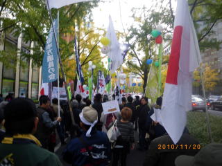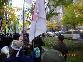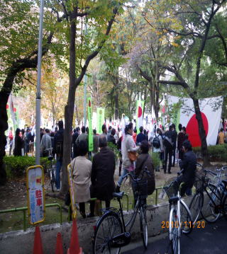 平成22年11月20日 「頑張れ日本!全国行動委員会」in 大阪の デモに参加しました。 写真は出発地点の公園です。 あるじも高さ3mの日章旗を掲げて参加です。 |