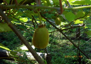 | 今年もキウイフルーツは豊作 !! あるじの菜園には雌株しか植えて いませんが、どこから花粉が 飛んでくるのでしょうか。 これも謎です。 |