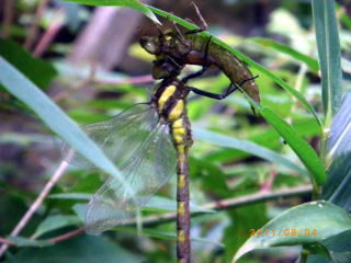 ヤブヤンマの羽化です。 池の中では、8匹のヤゴ、5匹のマツモムシ、 1匹のアカハライモリなどが互いに牽制しあっています。 メダカは彼らの餌になったようです・・・(泣)。 |