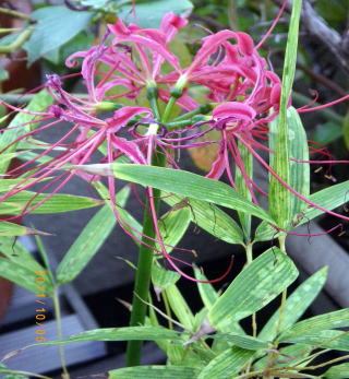 彼岸花が咲いています。 2年前に通販で購入したものです。 昨年は全く咲かなかったので、枯れたものと あきらめていました。 ところが、突然ニョキッ~と茎だけが伸びて きて、花が咲きました。 花があるときは葉はなく、葉があるときは 花がない・・・ けったいな植物ですな・・・ |