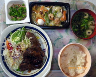 焼き肉(ハラミ)、サラダ、八宝菜、納豆、味噌汁