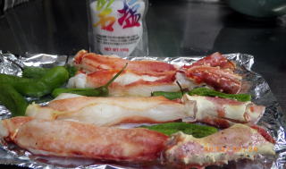 バターと岩塩で味を調え、完成( ^o^)ノ シシトウは彩りのための付け合わせ。 1人で食うカニは最高(^_^) |