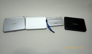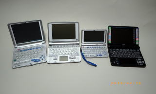 古いものから順に並べました。左端がシャープ製で 最も古いのですがよく使っています。 左から、 シャープ、カシオ、シャープ、カシオとなっています。 右端の黒いヤツが今回購入したものです。 |