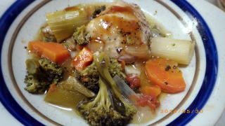 まず、ニンジンを入れ、鶏胸肉は切らずにそのまま上に載せ、残りの野菜をドバッと入れます。オリーブオイルを軽くかけ、あるじ愛用のドイツの岩塩と黒コショウを振りかけ、1時間蒸し焼きに(^_^)